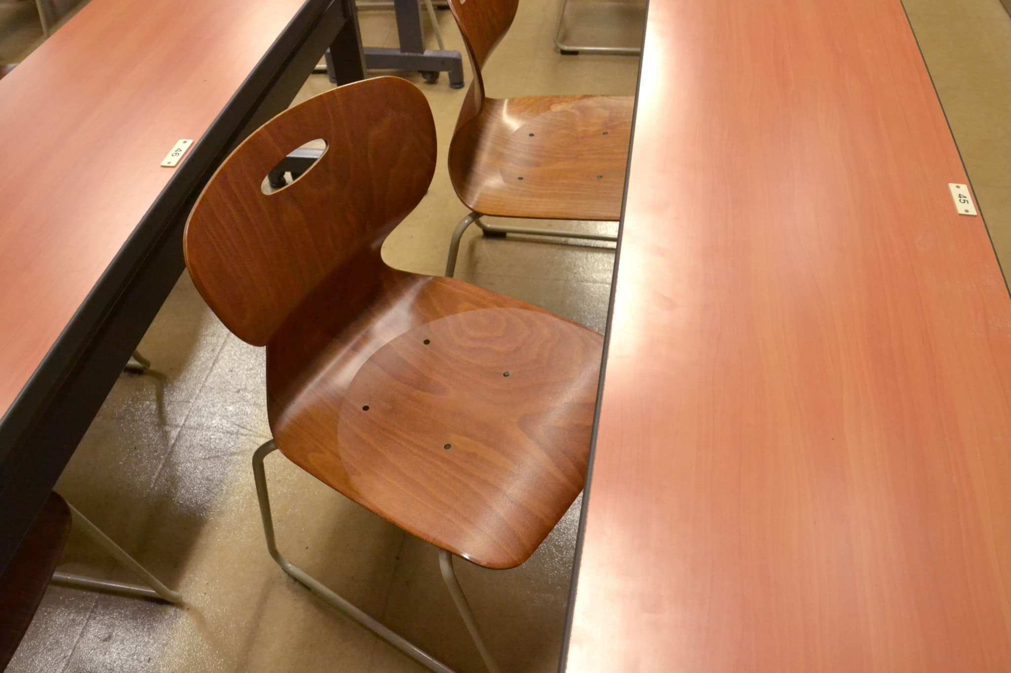 大教室の椅子(上)は後ろの机とくっついているタイプです。試験会場の中で比較的座り心地が良いです。一方で、小教室の椅子(下)は固い木製の椅子で背もたれが特殊な形をしていますが、ガタガタはしにくいです。 腰が痛くなりやすい人は、座布団やマフラーなどを持っていると便利でしょう。