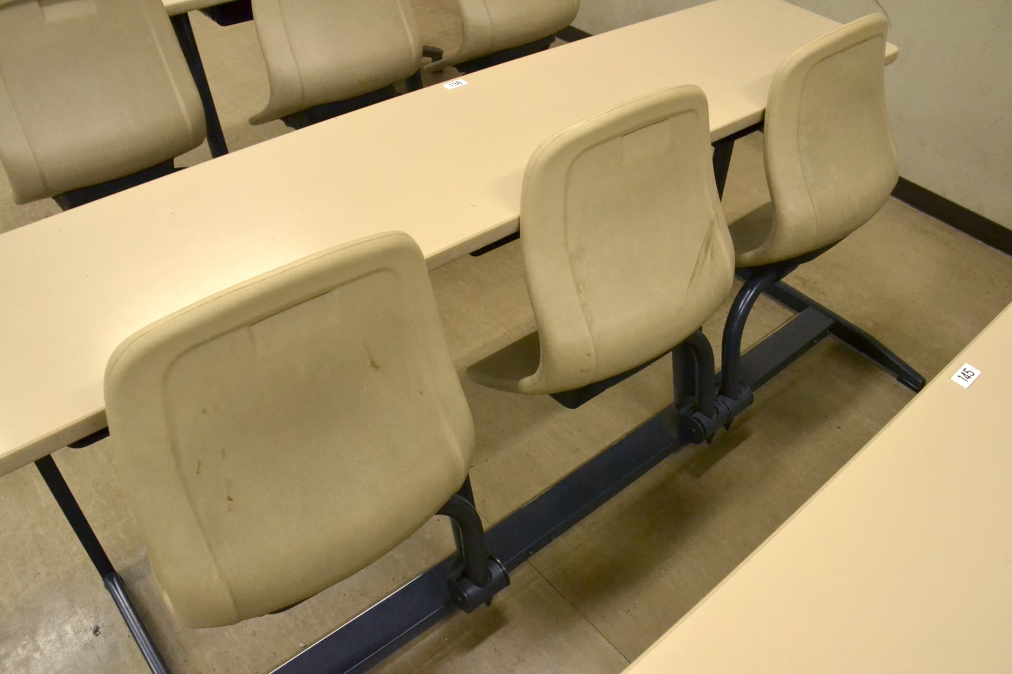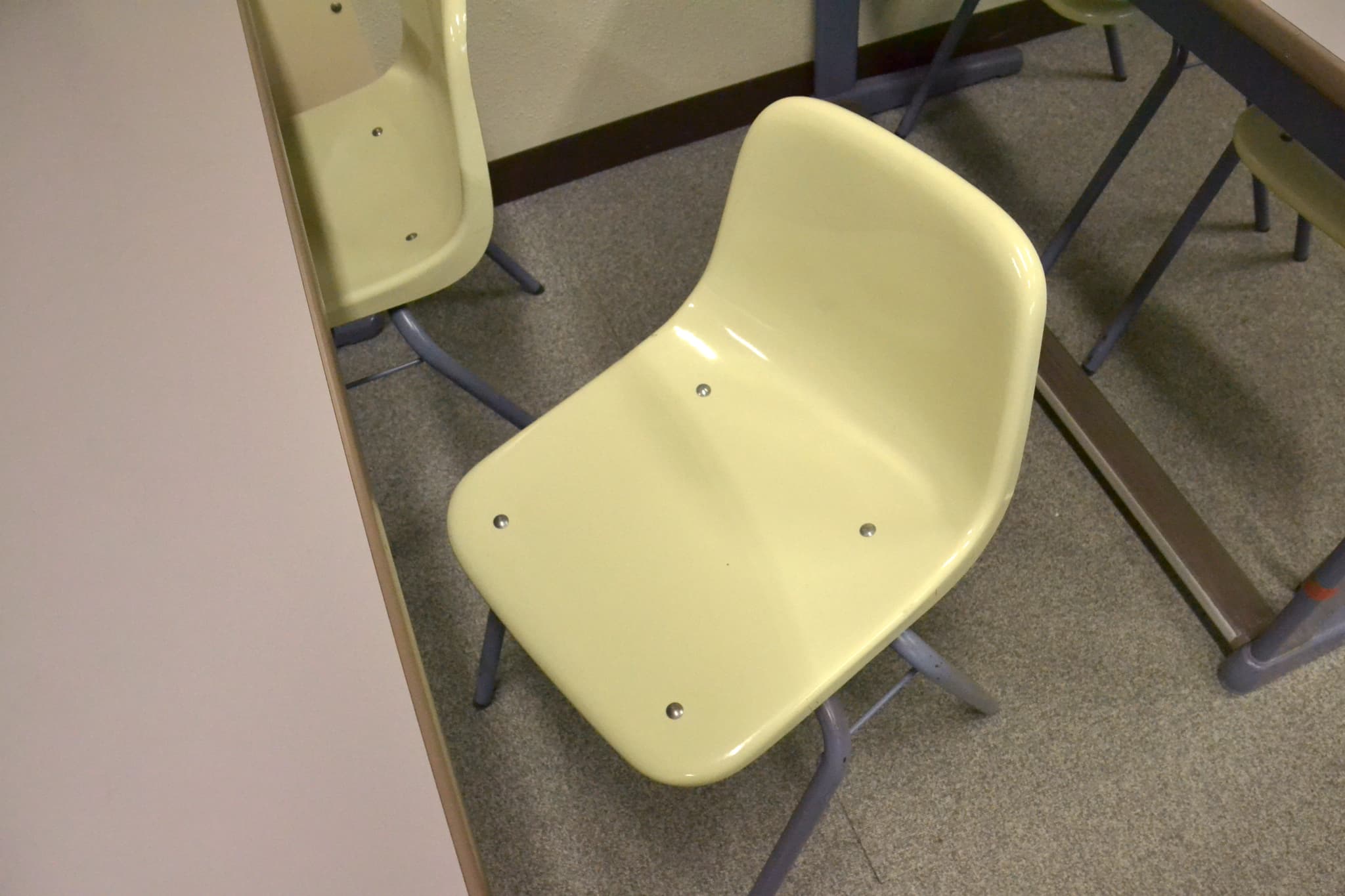普通の固さの椅子です。後ろの机につながっているタイプなので、後ろの机の振動が直接伝わってきます。大学特有の教室のせいか、机との距離感・椅子の低さに違和感を覚えた受験生もいたようです。固定式なのでどうしようもないですが……不安な人は座布団を持って行くことをおすすめします。