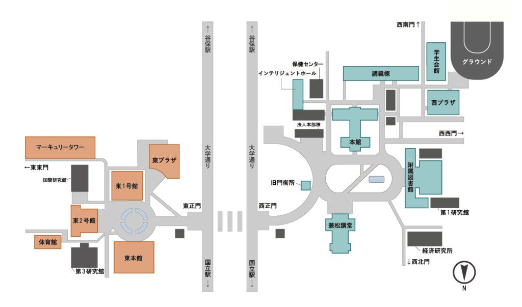 こちらが国立キャンパスの大まかな地図なのですが、JR中央線・国立駅とJR南武線・谷保駅を一直線に結ぶ「大学通り」を境にキャンパスが東西にわかれています。西側(図の青色の部分)が西キャンパス、東側(図のオレンジ色)が東キャンパスです!