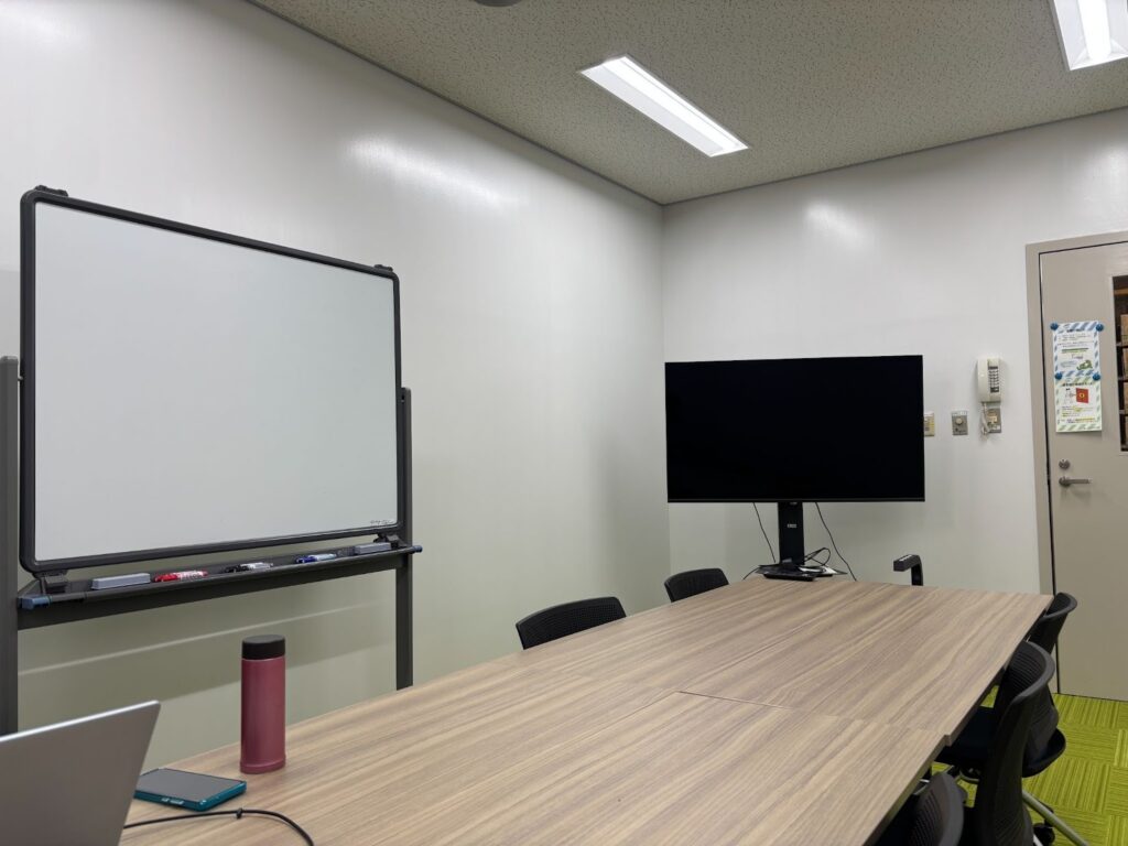 また本館2F・雑誌棟5Fにはグループ学習室という場所もあります。ここは学生3人以上で利用できる場所であり、ホワイトボードや長机が備えられているため複数人で一緒に勉強したり研究したりするのにうってつけの場所です。この春に改修工事で新たに4Kモニターも設置されて、さらに便利になりました!