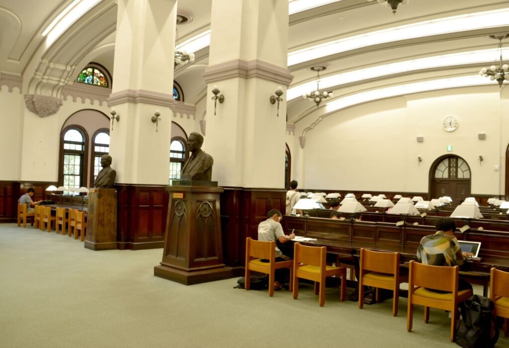 個人的なおすすめスポットは時計台棟2Fの大閲覧室です。ここは図書を閲覧したりそれぞれの学習に取り組んだりする「自習室」のような空間であり、330席もの座席数があるものの、学期末には試験勉強やレポート作成に取り組む学生で混雑しています。高い天井やステンドグラス、シャンデリア風の照明などがあることから、荘厳な雰囲気が感じられます。