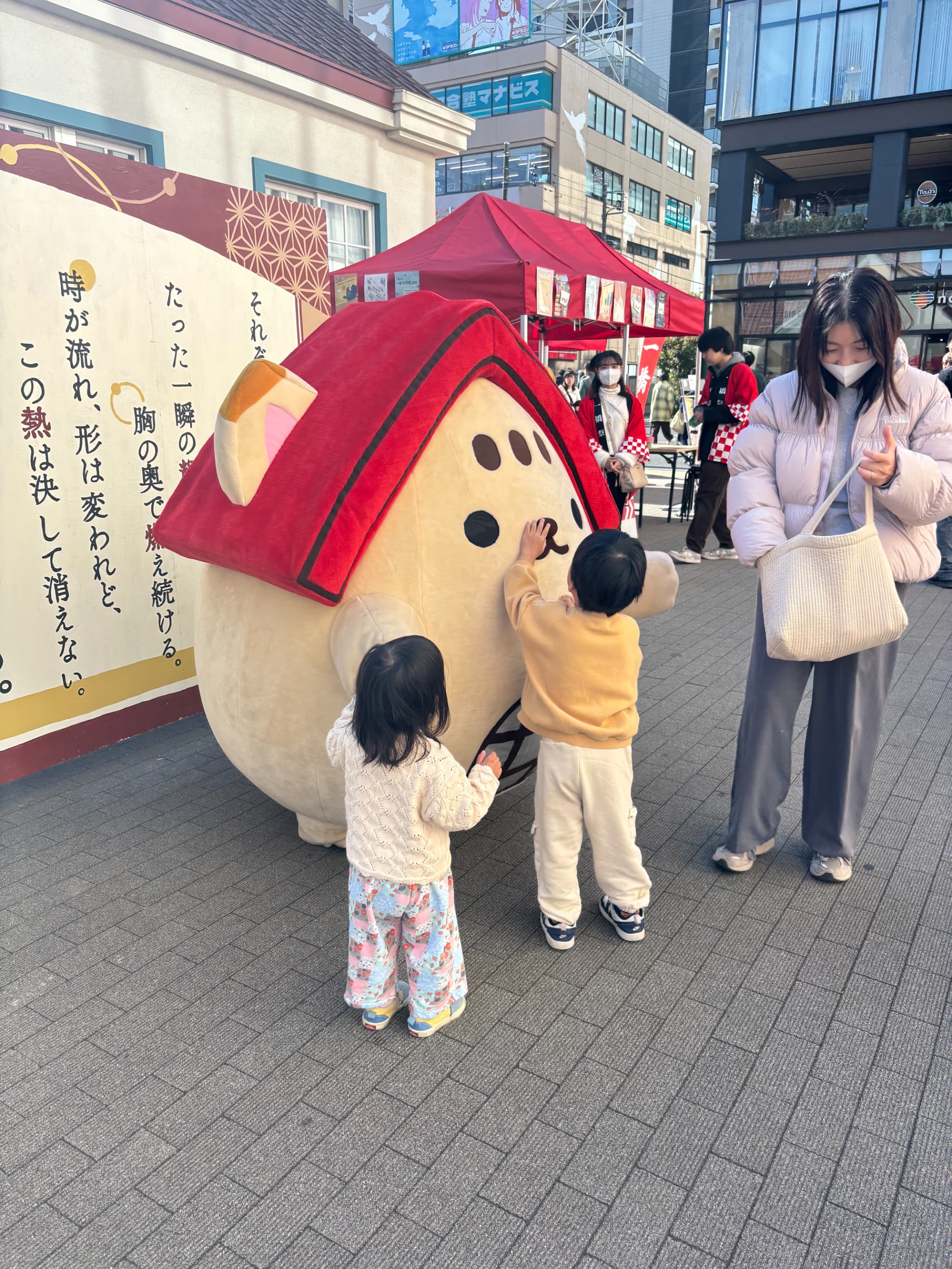 一橋大学の森の奥に住むたぬき。祭りの熱気に誘われて姿を現した。チャームポイントはキラキラの目とモフモフのしっぽ。