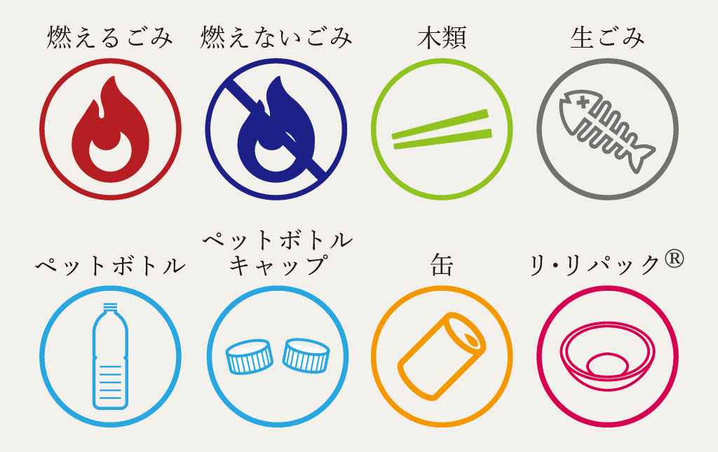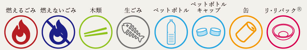 一橋祭では8種類のごみの分別(燃えるごみ、燃えないごみ、木類(割り箸・竹串)、生ごみ、ペットボトル、ペットボトルキャップ、缶、リ・リパック®)に取り組んでおり、来場者の皆さまには分別へのご協力をお願いしています。