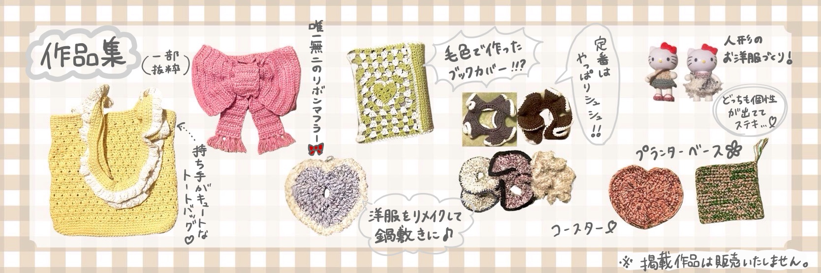 毛糸のシュシュやポーチ、ブックカバーなど、かわいい手づくり雑貨をたくさんご用意しました。作品はすべて手編みで、ひと目ひと目に温もりがこもっています。 編み物好きのメンバーが心を込めて作った一点ものばかりです。手芸好きな方も、通りがかりの方も大歓迎です。作品を見るだけでも楽しめる空間になっていますので、ぜひ気軽に遊びに来てください。あなただけのお気に入りの一作品との出会いをお届けします。