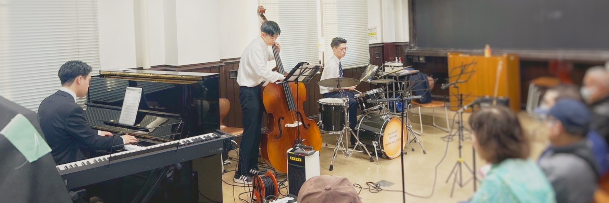 教室内でコンボジャズの演奏をします! コンボジャズとは、少人数のジャズバンドのこと。我々モダンジャズ研究会は一橋祭のためにバンドを結成し、練習を重ねてきました。