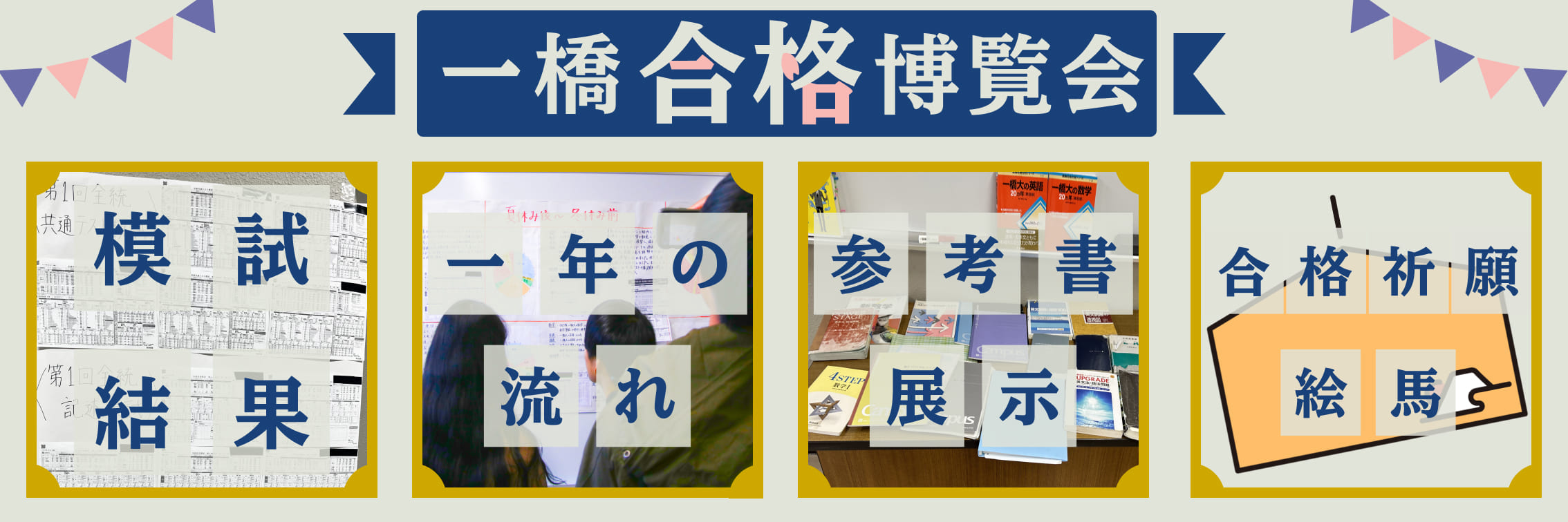 一橋合格博覧会では、一橋生が実際に使用していた参考書やノート、さらには高校時代の模試や入試本番の成績を展示しており、ここでしか得られない受験情報が盛りだくさん! 合格祈願絵馬コーナーでは、あなたの受験への意気込みを絵馬に書き込んで掲示したり、一橋を目指す来場者の絵馬を見て同志たちの声を知ったりすることもできます。 ぜひ気軽に足を運んでください!