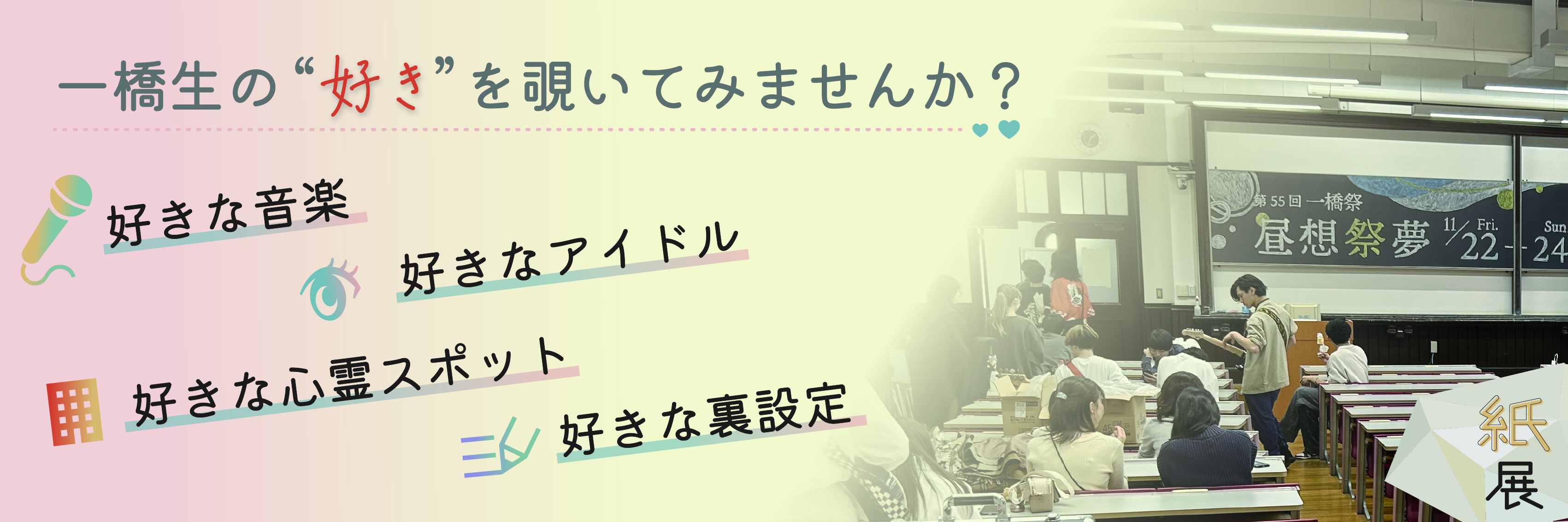 休憩所兼連絡通路である本館2F 21教室において、一橋生の「好き」な物、事を紙上に展示します。休憩がてらぜひご覧ください!!!