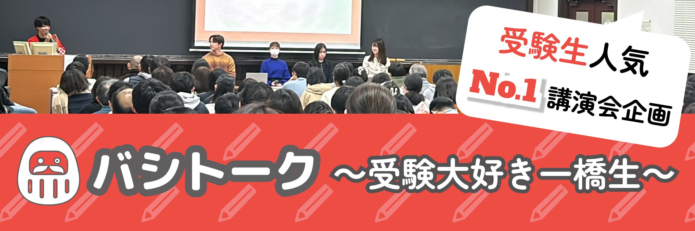 受験生人気No.1講演会企画、「バシトーク」を聞いて君も合格への切符を手に入れよう! 今年一橋に入学した1年生が、受験の成功談や失敗談を語ります。加えて、受験生が気になる一橋受験のあれこれもご紹介! 対談の最後には追加質問の時間もあり、直接疑問を解消することも可能です。 トーク対談型の企画なのでリラックスして参加でき、保護者の方も受験に役立つ情報を手に入れられます。ぜひお越しください!