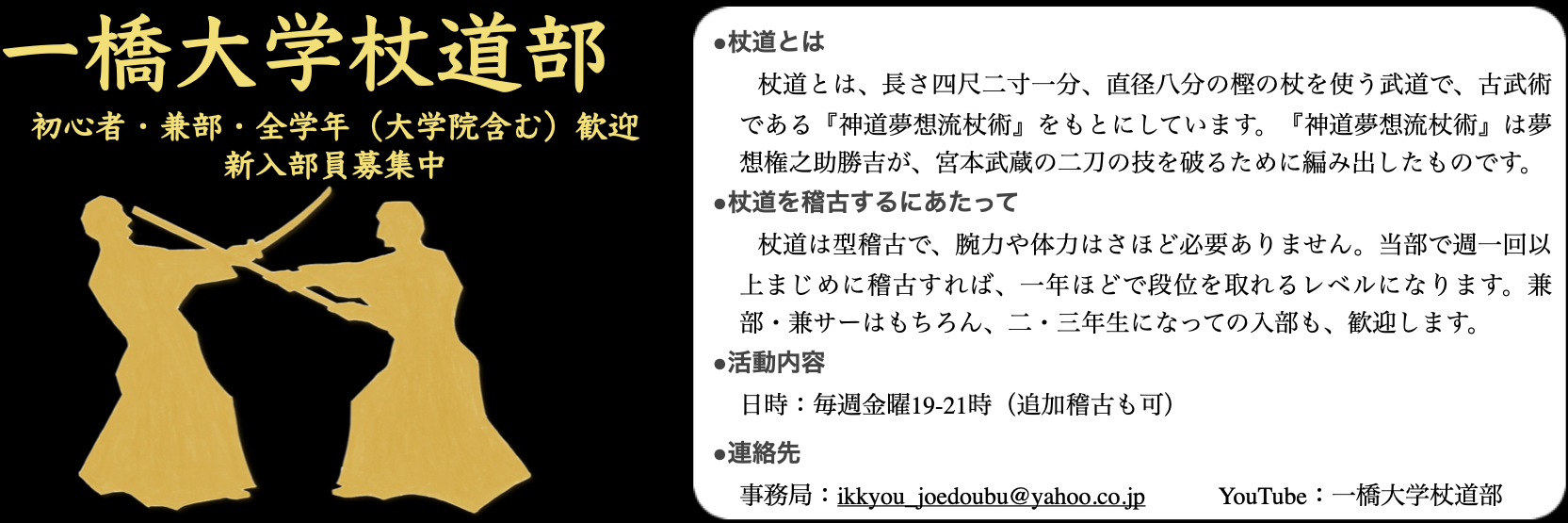 より詳しい杖道についての解説は、秀杖会および東京都剣道連盟杖道部会のホームページ、一橋大学杖道部のYouTubeチャンネル掲載の演武動画を御覧ください。