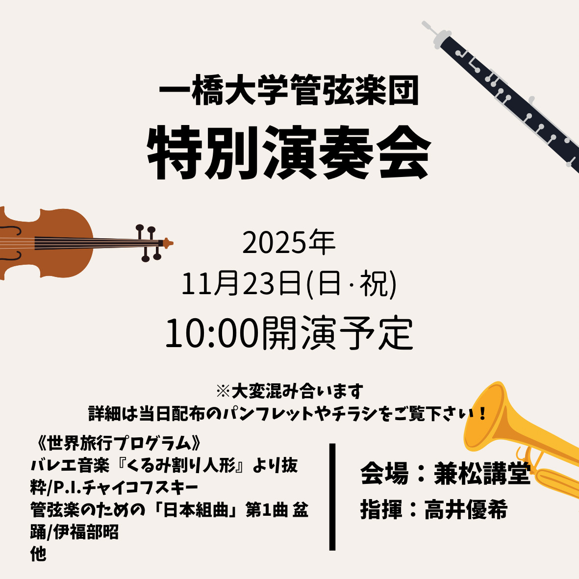 私たちは第56回一橋祭において、兼松講堂・旧国立駅舎にて演奏会を実施いたします。そのうち本企画の“一橋祭演奏会 2025”では、兼松講堂のグランドピアノ(スタインウェイフルコン)を用いた演奏を行います。形態はソロからアンサンブルまで、ジャンルはクラシックからポップスまで様々です。一橋生から音大生まで幅広い経歴の奏者が所属し、豊富かつ技巧的な演奏を披露いたします。